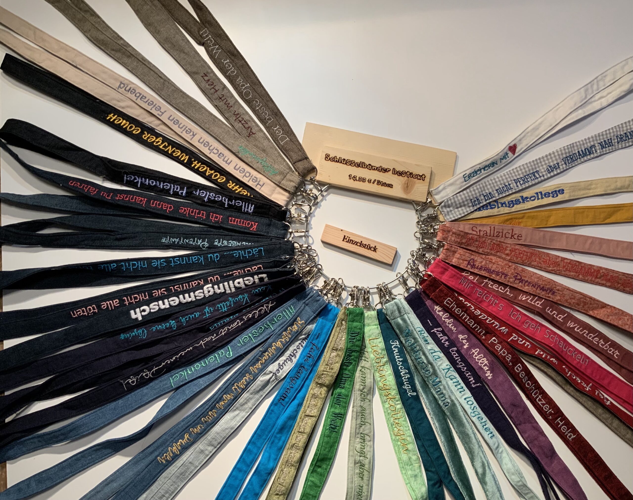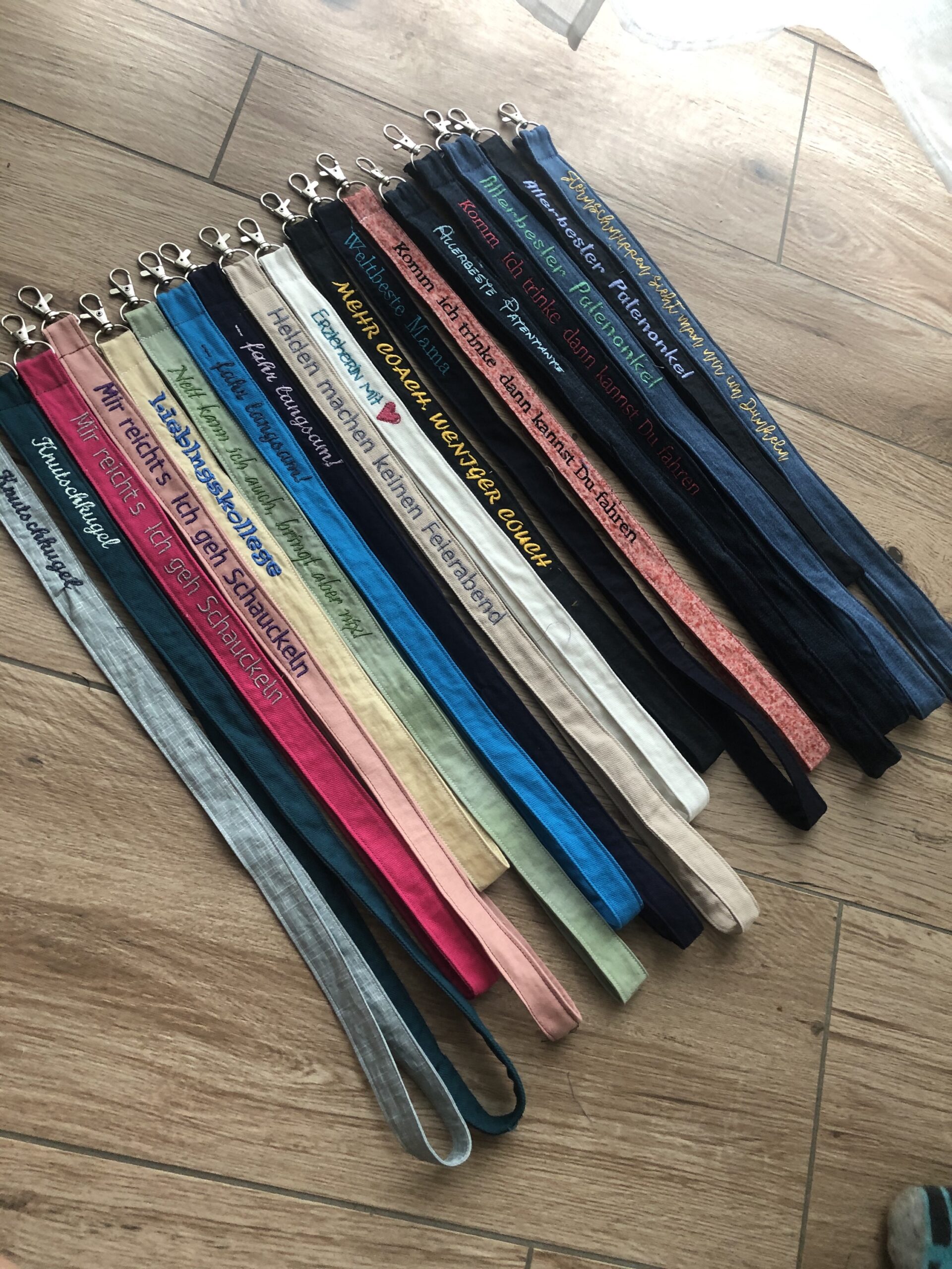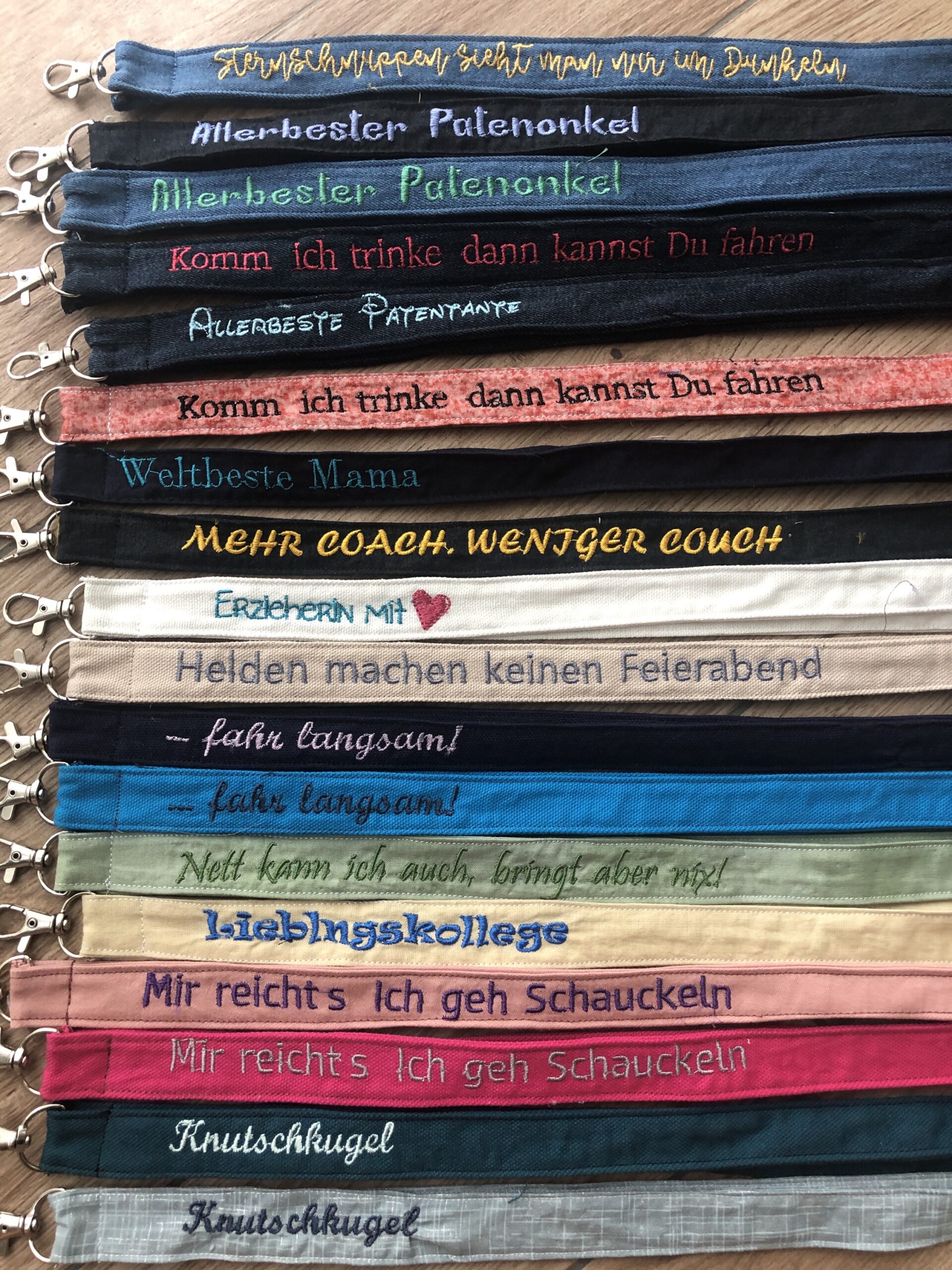 | Schlüsselband | Wunschtext, Ehemann, Papa, Beschützer, Held, Erzieherin mit ♥️, Komm ich trinke dann kannst Du fahren, Ärztin mit Herz, Sternschnuppen sieht man nur im Dunkeln, Lieblingskollegin, Knutschkugel, Der beste Opa der Welt, … fahr langsam!, Heldin des Alltags, Weltbeste Mama, … fahr langsam!, Lieblingsmensch, Allerbester Patenonkel, Alltagsheldin, Knutschkugel, Alles tanzt nach meiner Pfeife!, ich bin nicht PERFEKT, aber VERDAMMT NAH DRAN!, Bin da Kann losgehen, ALLERBESTE PATENTANTE, Lieblingskollege, Sei frech, wild und wunderbar, Weltbeste Mama |